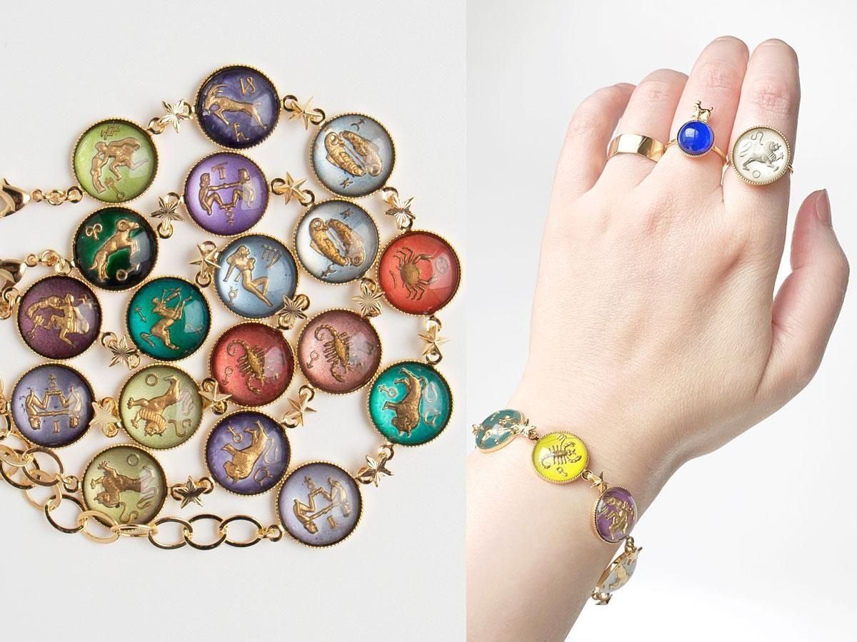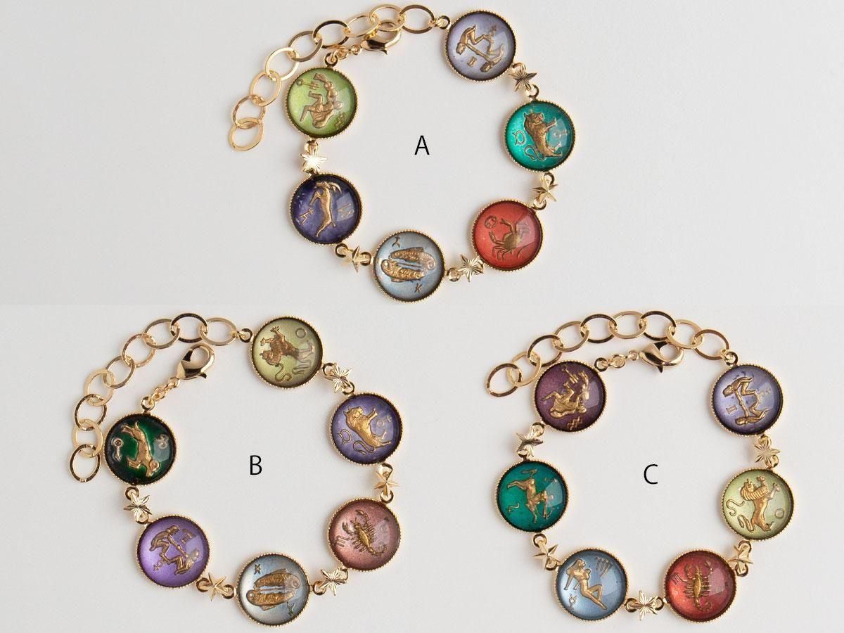 12星座のモチーフが裏彫りで表現されています。古いもののため色の剥げやムラ、ガラス表面の傷やカケが見られます。予めご了承ください。着用画像は色違いです。
