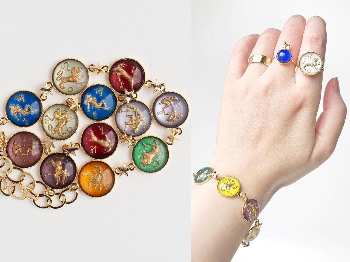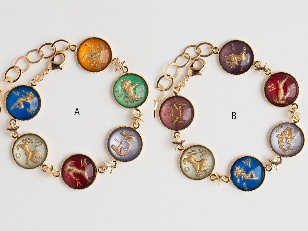 12星座のモチーフが裏彫りで表現されています。古いもののため色の剥げやムラ、ガラス表面の傷やカケが見られます。予めご了承ください。着用画像は色違いです。