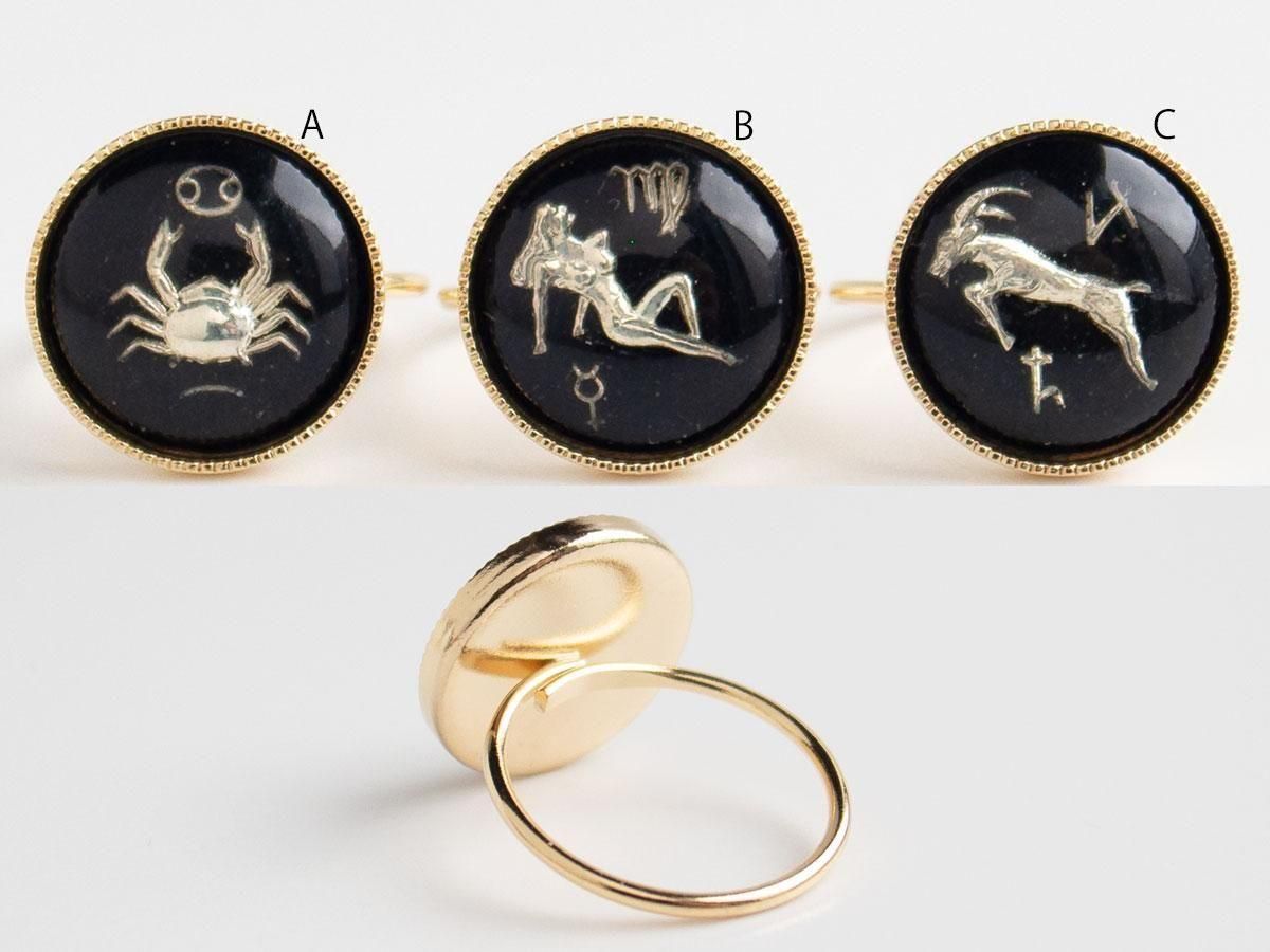 A:蟹座、B:乙女座、C:山羊座のインタリオガラスです。古いもののため色の剥げやムラ、ガラス表面の傷やカケが見られます。予めご了承ください。着用画像は色違いです。